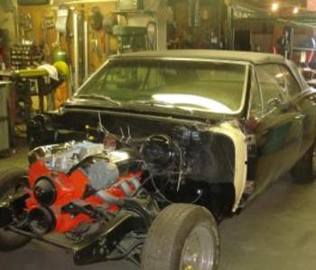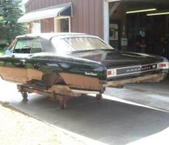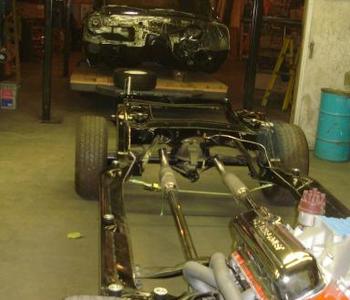 In 1983, I had it repainted black, while attending shows I became tired of the so called experts telling me it wasn't a true SS because of this or that so it was driven less and less as I transitioned into street rodding. Along about 1994, I took it out one day and it ran like crap so out came the motor. Shortly there after (thanks to the suggestions of several friends) the body came off the frame. At first things moved along at a brisk pace the motor was gone through, frame was stripped down, blasted and repainted and partially reassembled. Then things kind of stalled out. With street rods taking the bulk of my time, the Chevelle and its parts were pushed into a back corner. I managed to pick up a few parts over the years but no real progress was made until about 2009 when I had a spurt of energy and finished the chassis. Then business took over big time and it was pushed back into its corner. That brings us to present day when on Saturday, August 20, 2011, I rolled it out into the sunlight for the first time in 17 years to see what was left. After washing it up and cleaning the interior it's not in the worst of shape. A couple of chips in the paint is about the only damage I could find. As for the future, I have hopes of getting the underside of the body prepped and painted so it can be mated to the chassis yet this year.